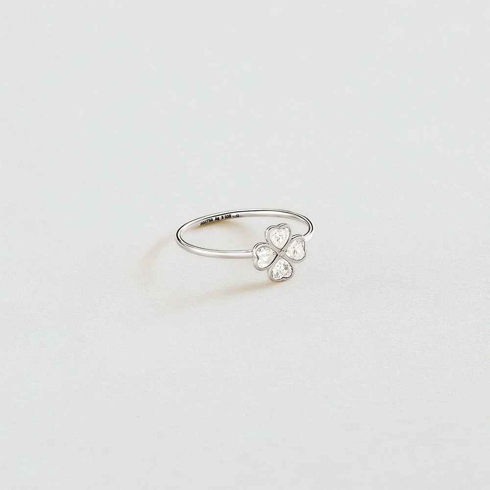 Bague en argent 925/1000 rhodié montée d’un trèfle au pétales d’oxydes de zirconium..