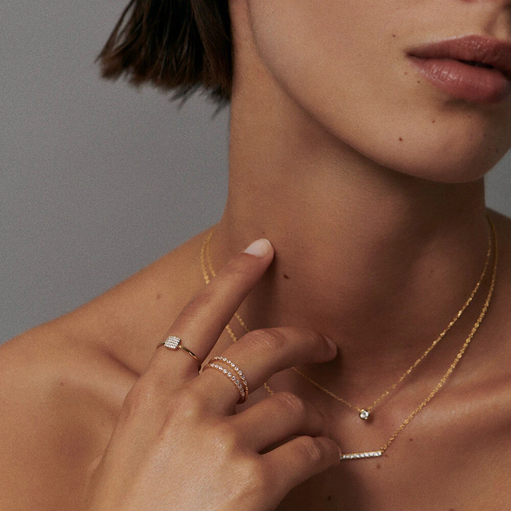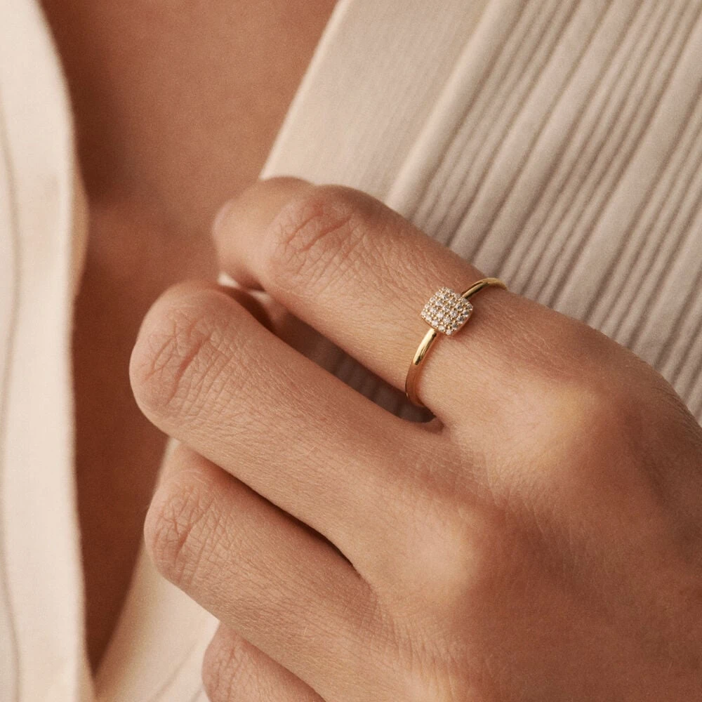 Bague fine, en argent véritable avec une couche d’or, avec un ornement de forme coussin et pavé d’oxydes de zirconium.