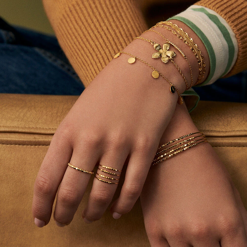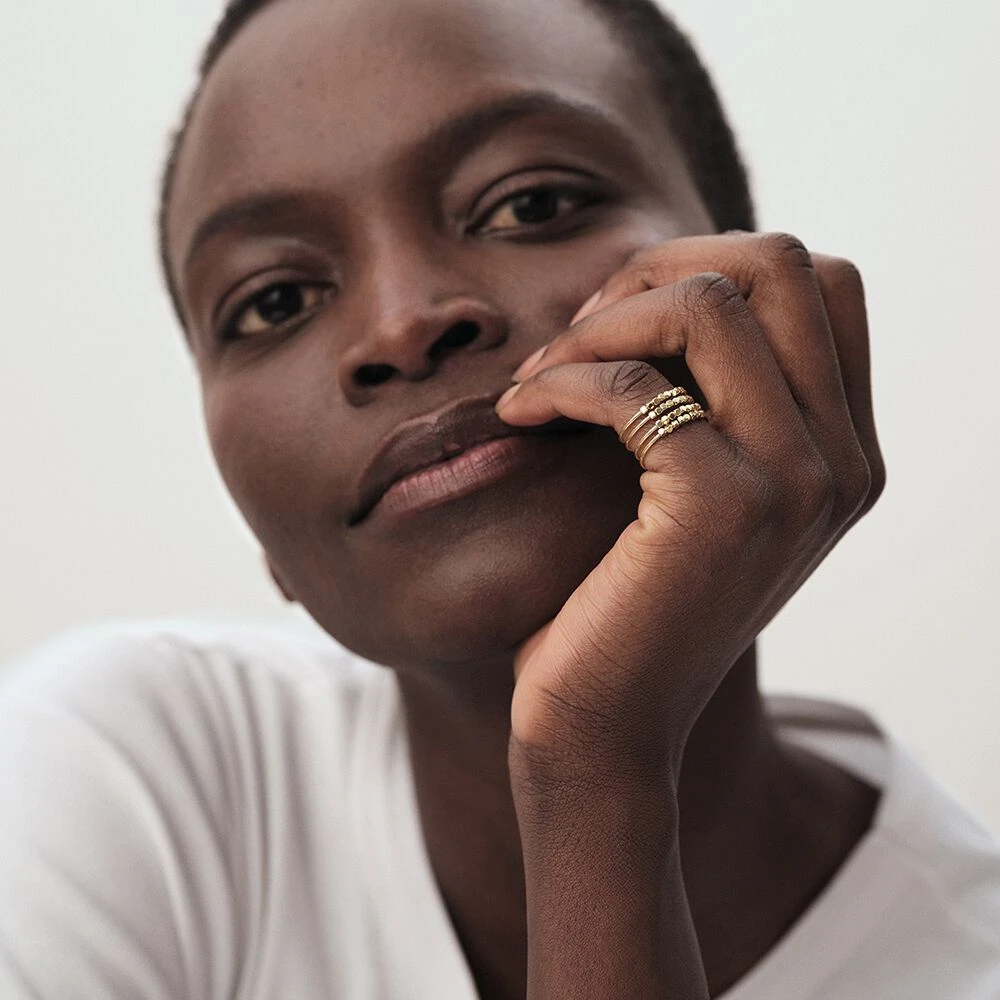 Bague tonneau, en laiton doré à l’or fin, constituée de 4 rangs filaires dont une partie est enfilée de perles métal.