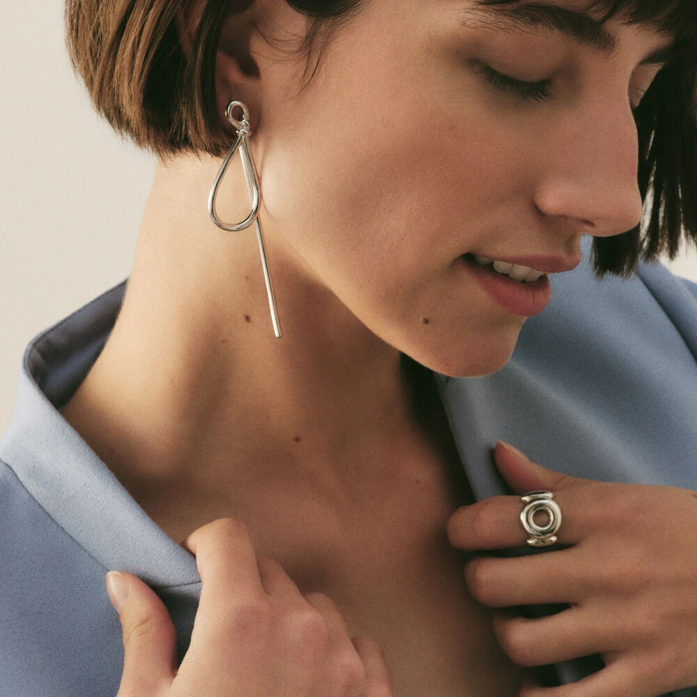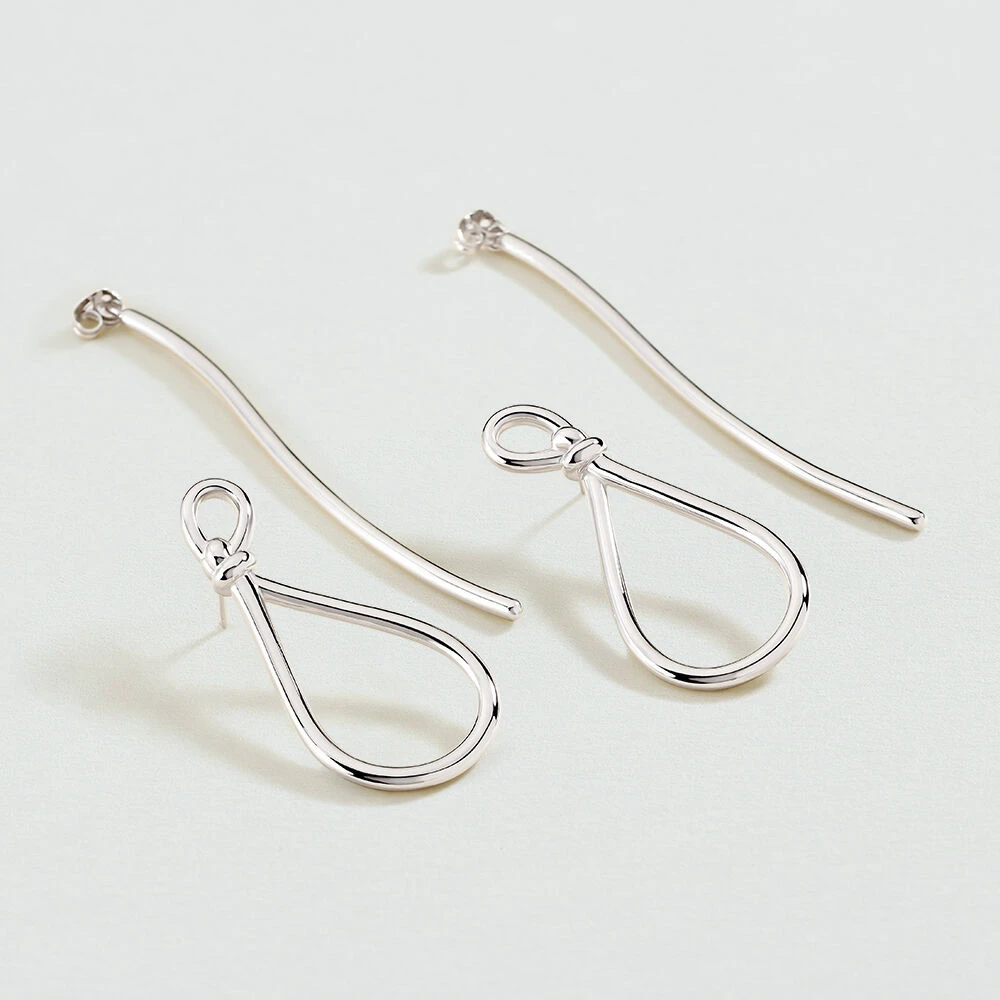 Boucles d’oreilles longues en laiton rhodié en forme de nœuds pouvant se porter avec ou sans la tige au dos.
