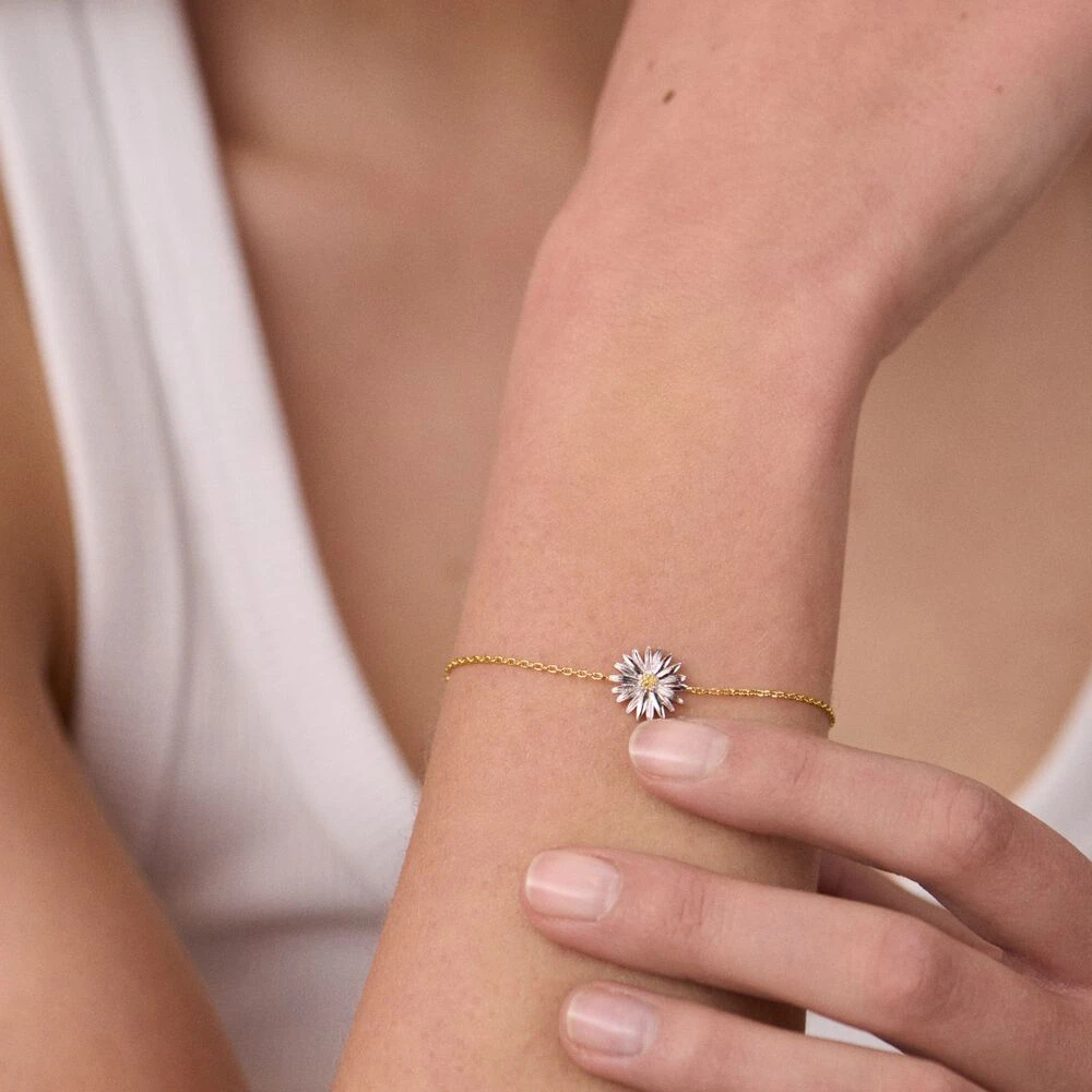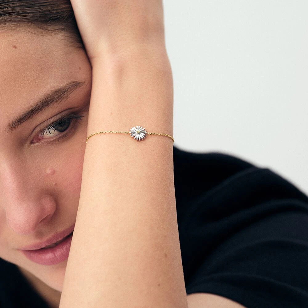 Bracelet en laiton doré à l’or 750/1000 et rhodié. Ce bracelet est centré d’une délicate fleur bicolore pouvant se porter du côté argenté comme du côté doré selon vos envies ! . Ce bijou mesure 150mm et contient une rallonge de 30mm