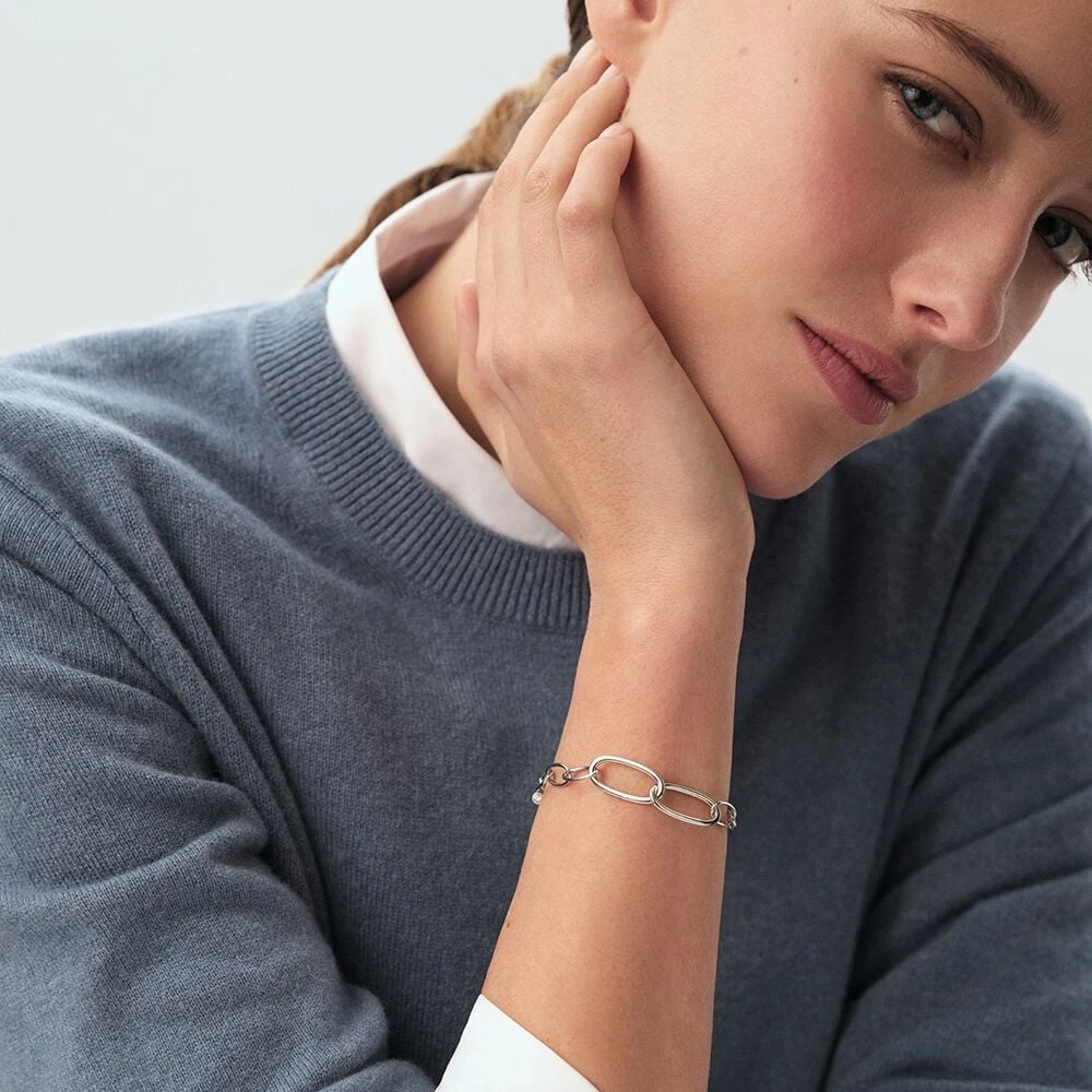 Bracelet souple, en laiton rhodié, maillons ovales allongés dont deux XL au centre et notre fermoir T identitaire.