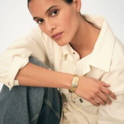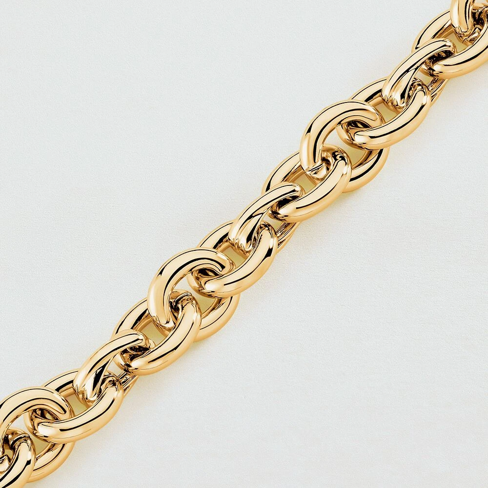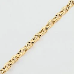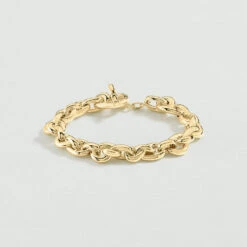 Bracelet maille en laiton doré à l’or 750/1000. Une maille avec de gros anneaux dont un en forme de X ainsi qu’un fermoir T-barre. .