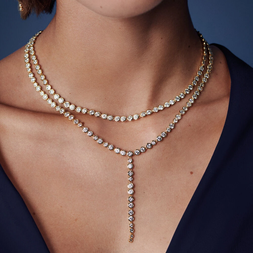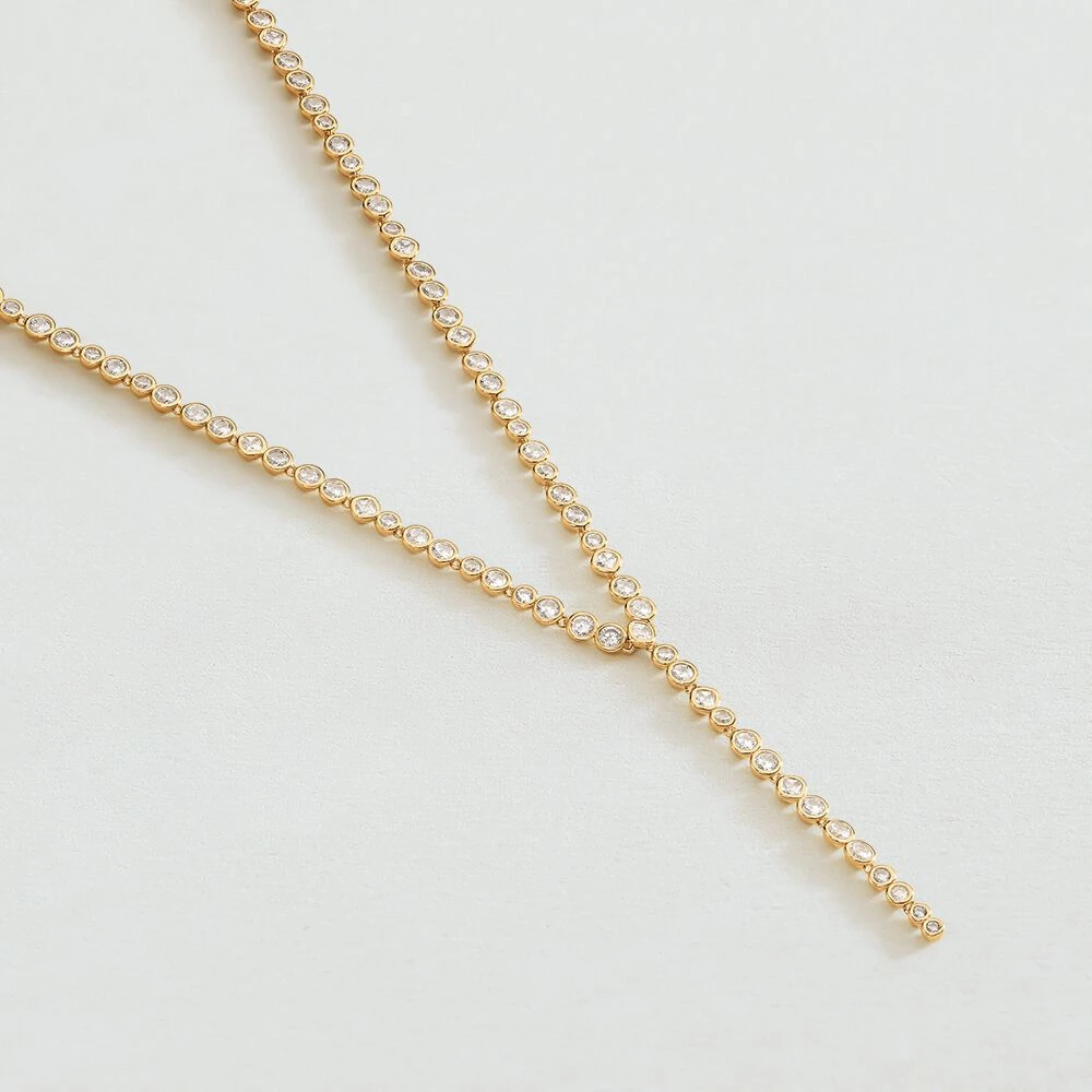 Collier Y, en laiton doré 750/1000, chaine tennis d’oxydes de zirconium sertis clos.