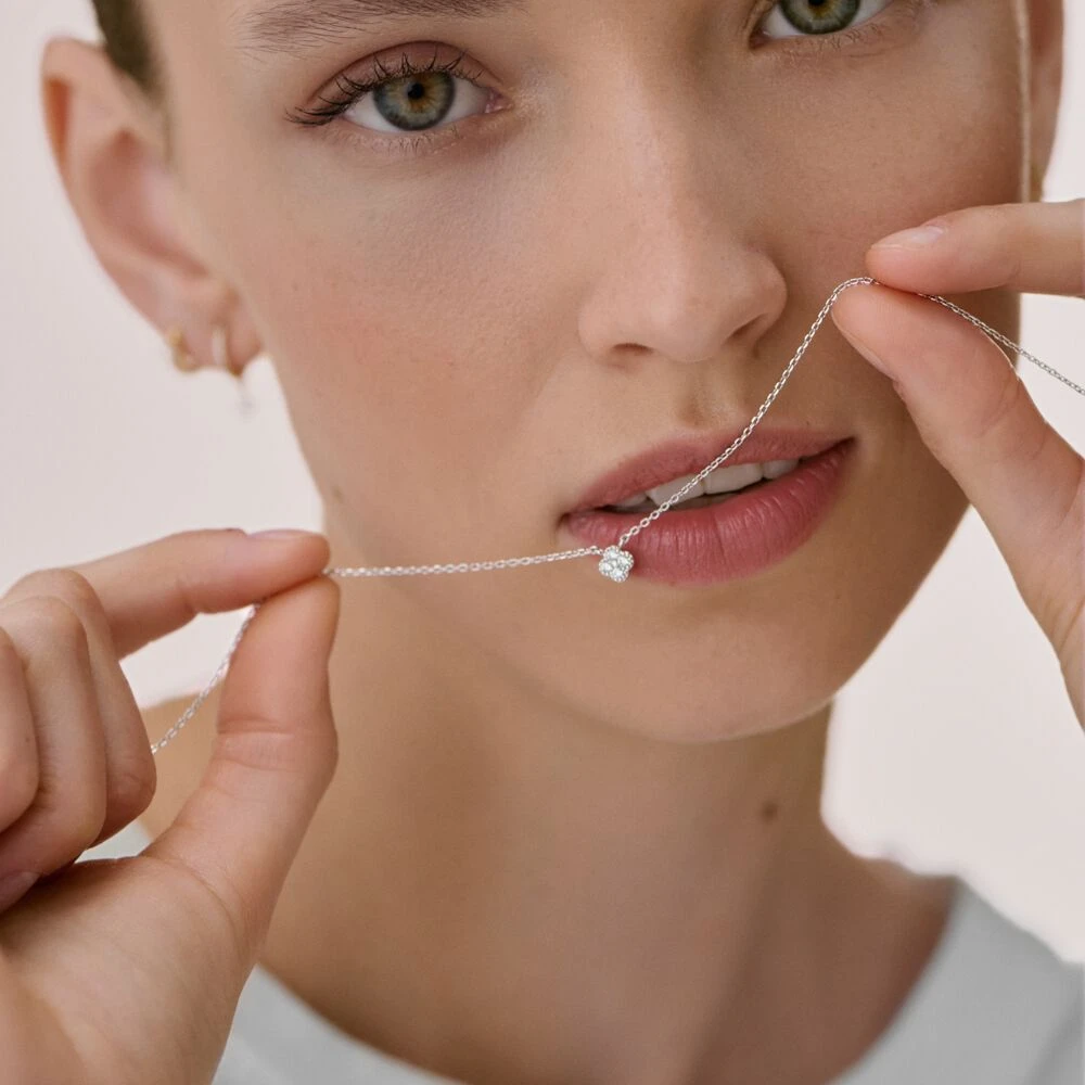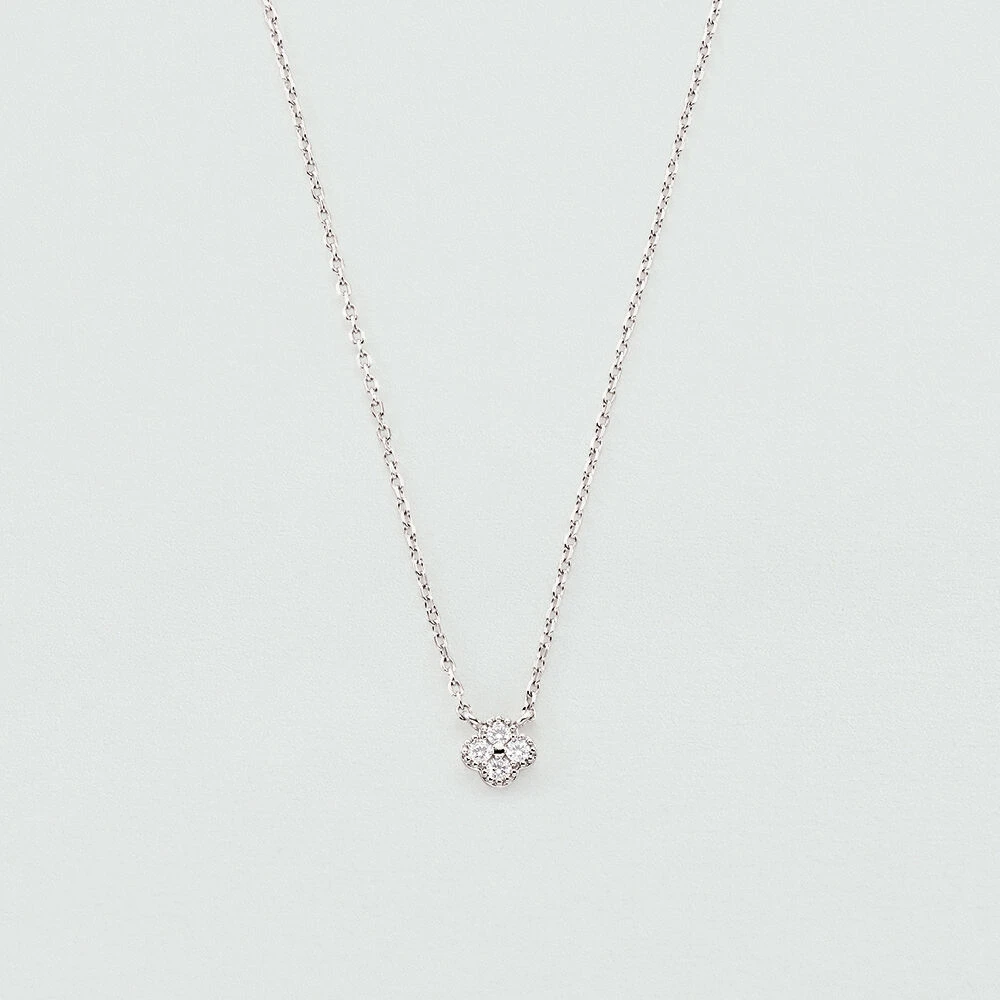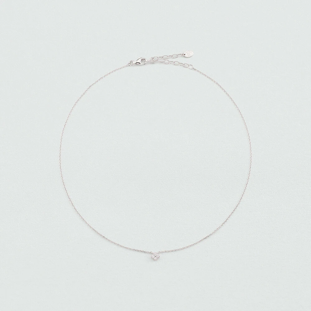 Collier, en argent véritable, avec un pendentif en forme de fleur dont les pétales sont des oxydes de zirconium et dont le pourtour est finement réalisé avec un graineti. Ce bijou mesure 375mm et contient une rallonge de 50mm