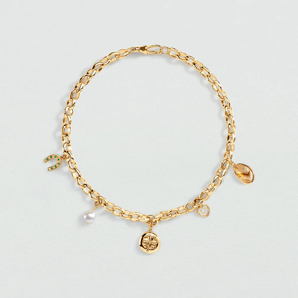 Collier en laiton doré à l’or fin 18K, composé d’une maille épaisse martelée et orné de cinq pendentifs emblématiques d’Agatha. Les pendentifs sont les suivants : un fer à cheval serti d’oxydes de zirconium verts, une perle naturelle, un médaillon porte-bonheur en forme de trèfle à quatre feuilles, un cœur serti d’oxydes de zirconium, et un quartz rutile..