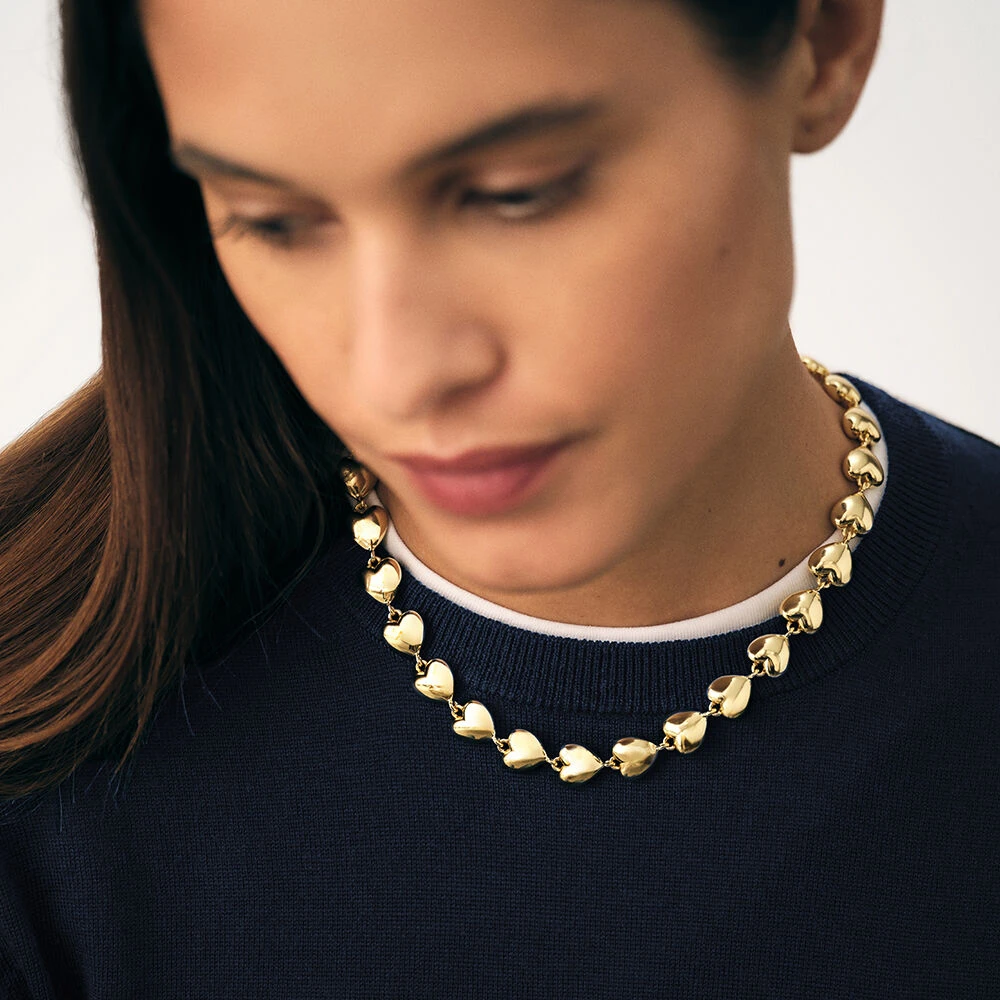 Collier en laiton doré, orné d’un rang de cœurs en métal et d’un cœur en oxyde de zirconium scintillant.