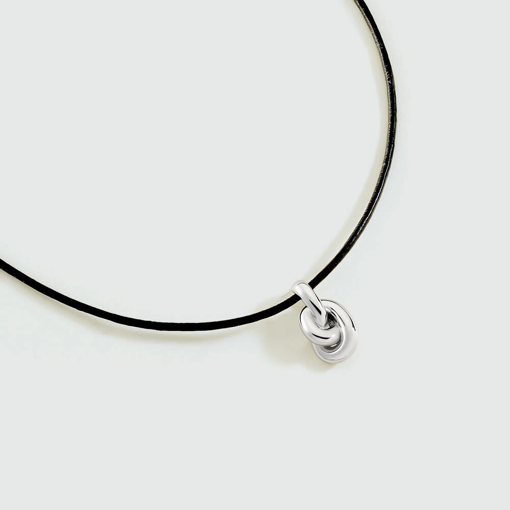 Collier en laiton rhodié et cordon cuir avec un pendentif nœud..