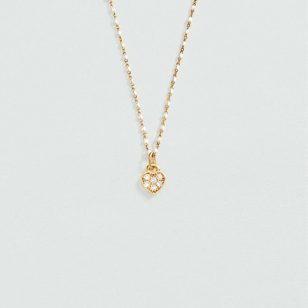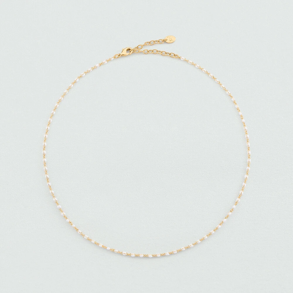 Collier en laiton doré à l’or fin avec de petites billes d’émail coloré Ce bijou mesure 375mm et contient une rallonge de 50mm