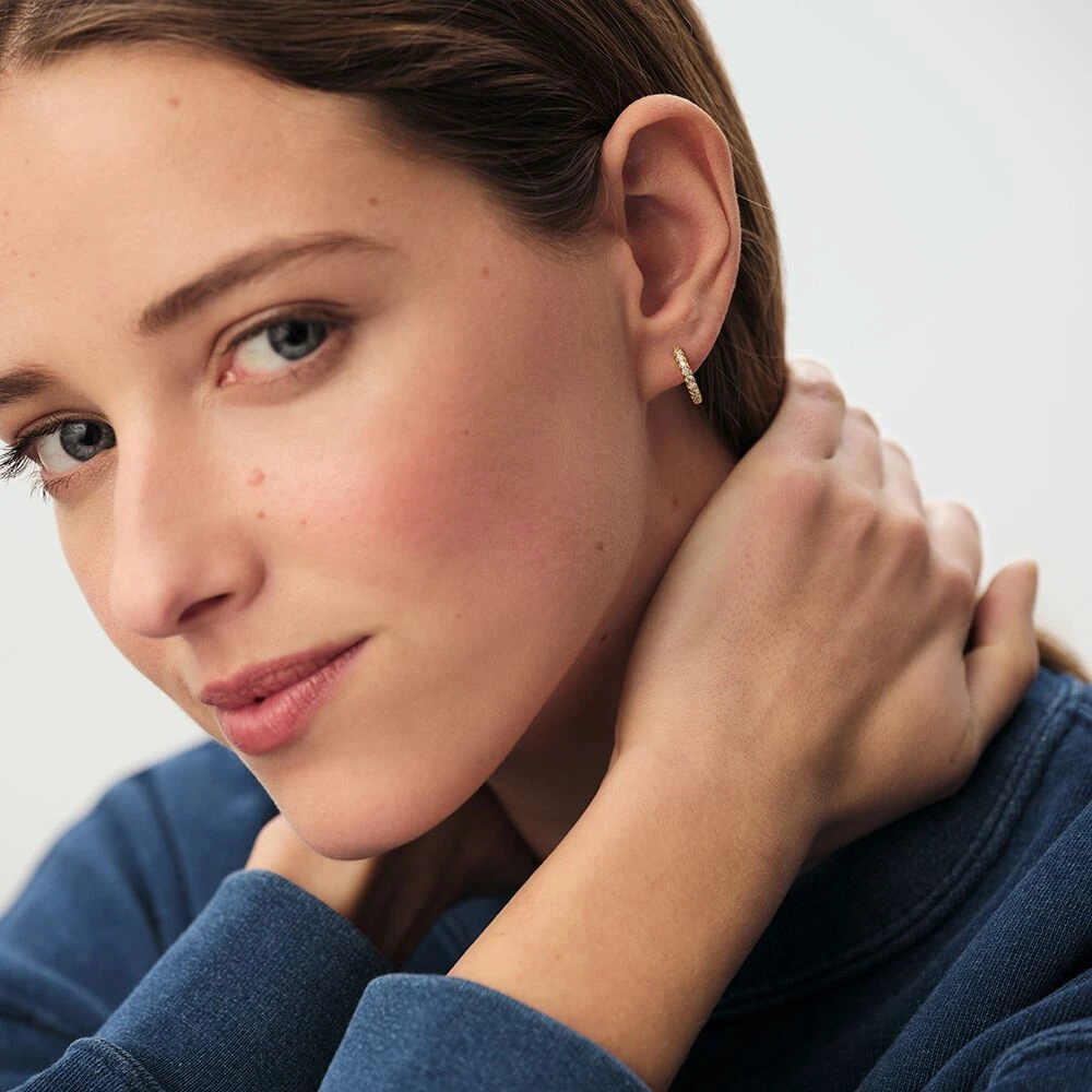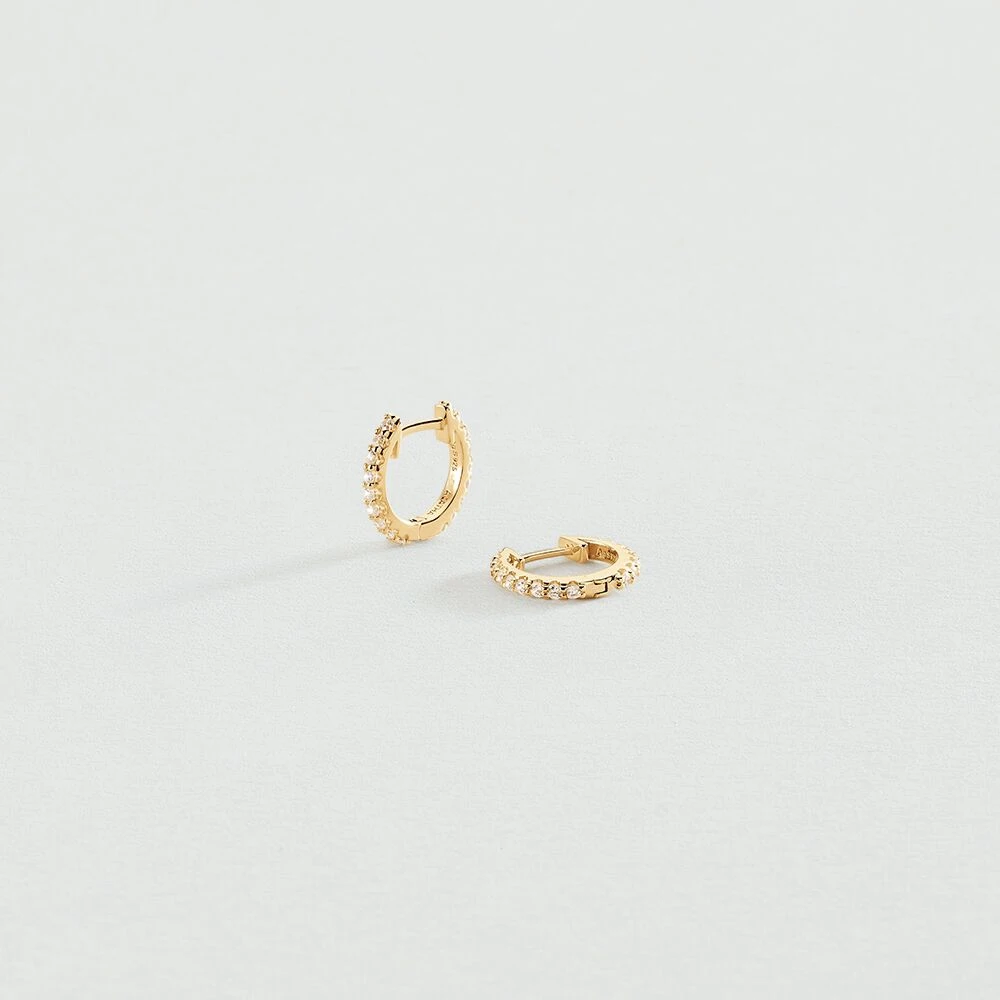 Boucles d’oreilles mini-créoles, en argent véritable dorées 750/1000, pavées d’oxydes de zirconium.