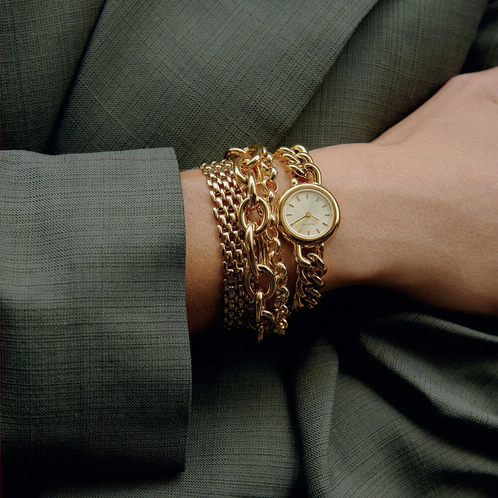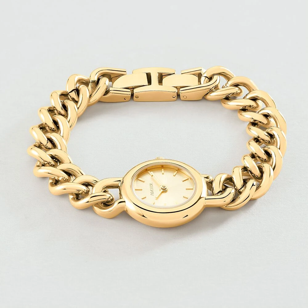 Montre en acier inoxydable de 19 cm de longueur, chaine gourmette et boitier rond de 25mm de diamètre au look vintage, fond de cadran rayonnant, étanchéité de 5ATM, mouvement Quartz. Rallonge de 2 cm incluse. Rallonge individuelle supplémentaire disponible à la vente.. Ce bijou mesure 170mm et contient une rallonge de 15mm