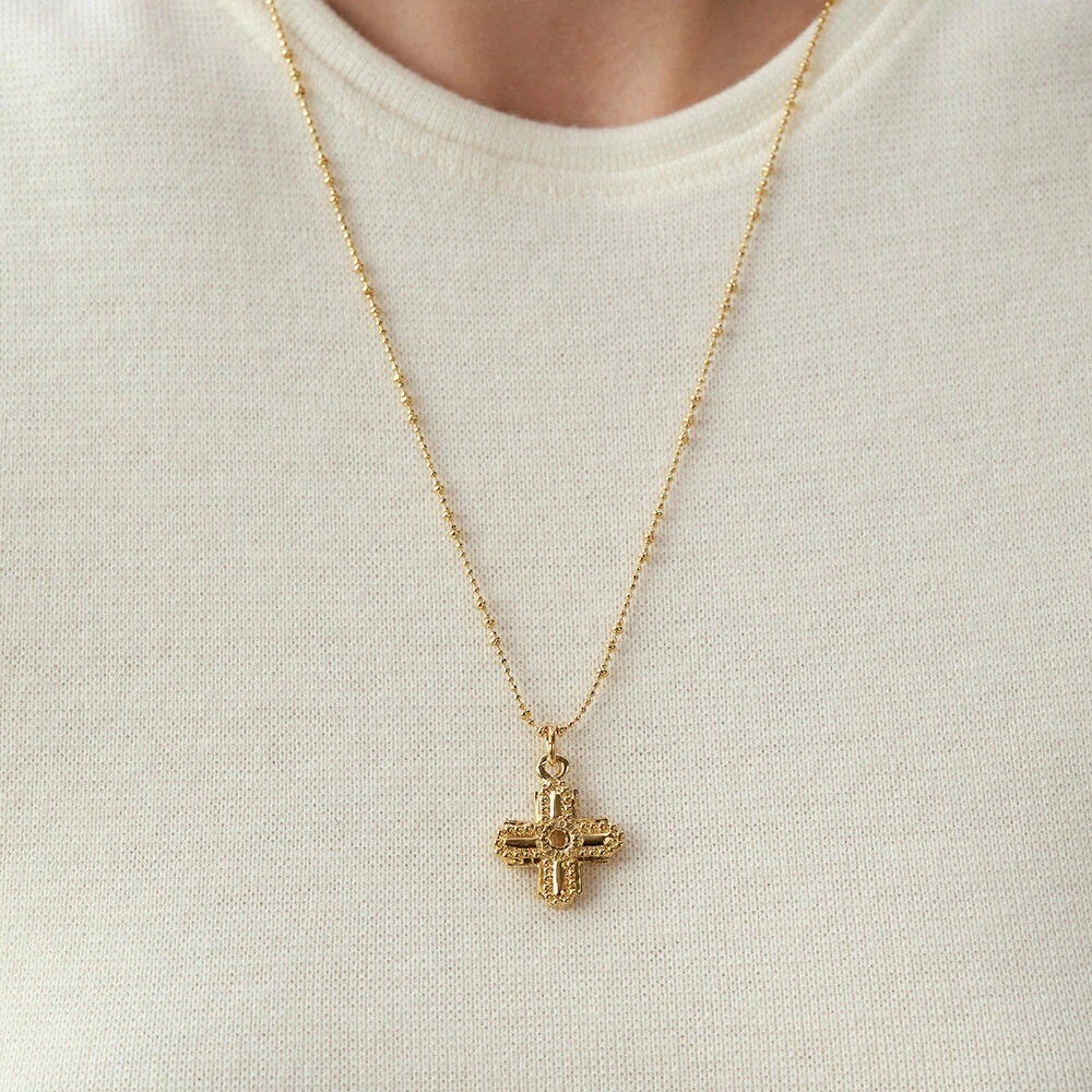 Pendentif en métal doré à l’or fin en forme de croix.