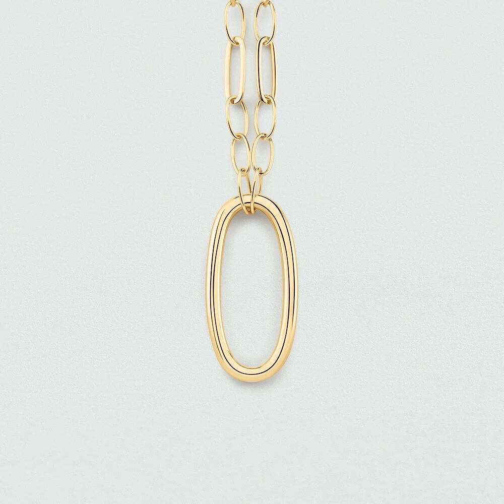 Sautoir, en laiton dorĂ© 750/1000, fait de maillons ovales allongĂ©s et dont l’un XL se porte en pendentif.